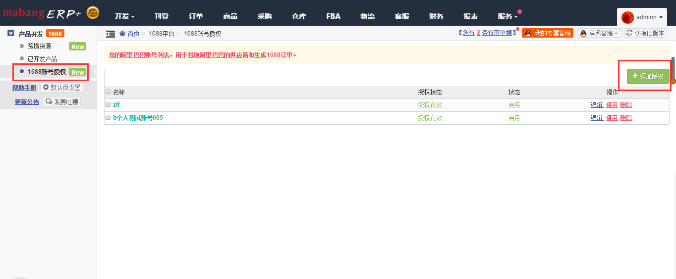 点击立即授权1688帐号,进入1688帐号授权页面,点击添加授权